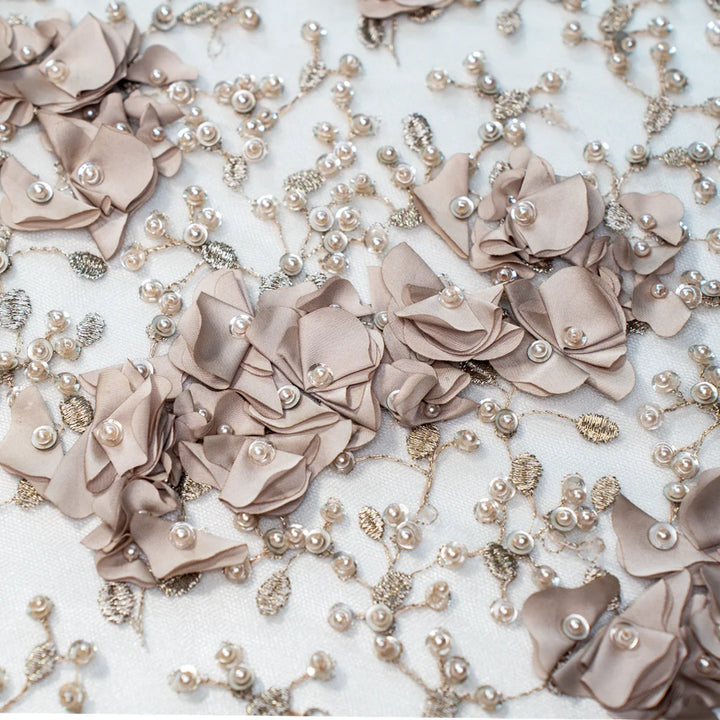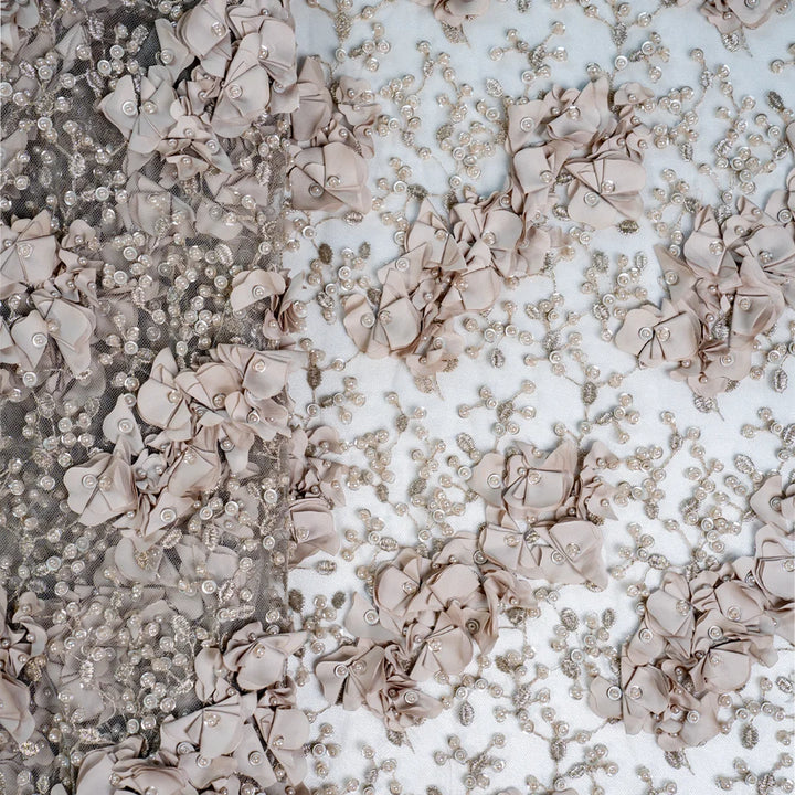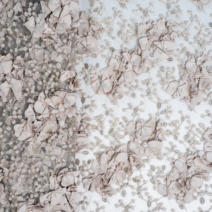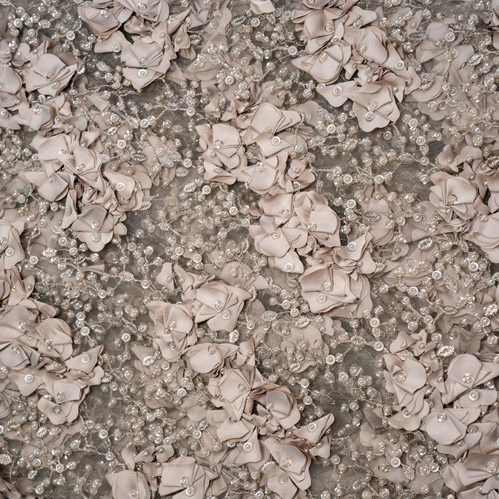 Luxurious soft grey net, embellished with 3D satin flowers, pearl beads, and metallic thread embroidery. This elegant fabric is perfect for bridal lehengas, couture gowns, statement dupattas, designer sarees, evening jackets, and luxury fusion wear.