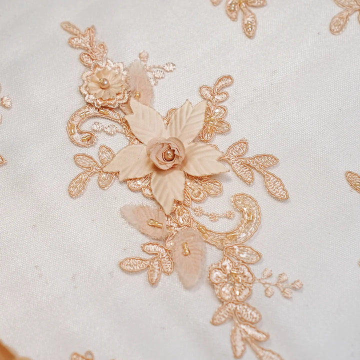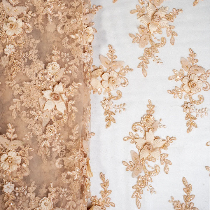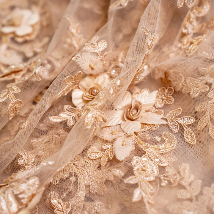 A champagne beige net fabric adorned with intricate 3D floral appliqués, delicate thread embroidery, and pearl bead accents. The handcrafted flowers and metallic lacework lend it a soft, romantic elegance—ideal for bridal lehengas, engagement gowns, statement dupattas, pre-draped sarees, couture jackets, and designer blouses.