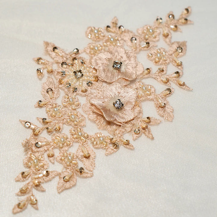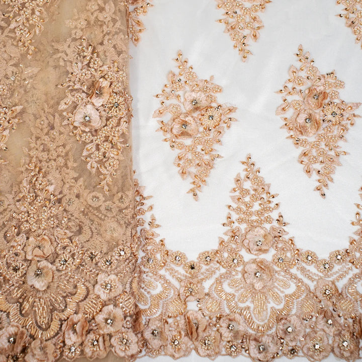 A champagne gold net fabric intricately embroidered with sequins, 3D silk florals, pearls, and crystal embellishments. Luxe hand detailing and scalloped floral borders give it a radiant couture appeal. Perfect for bridal lehengas, statement dupattas, saree borders, reception gowns, festive capes, or blouse highlights.