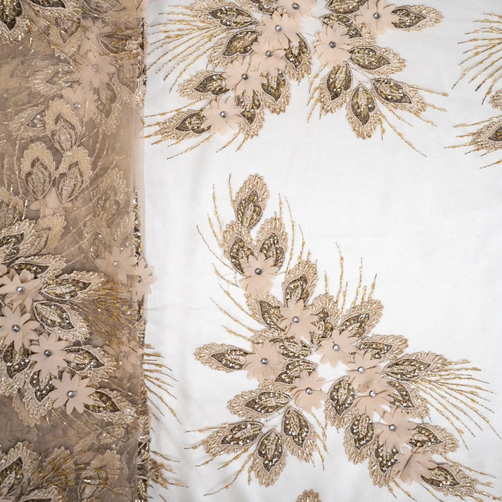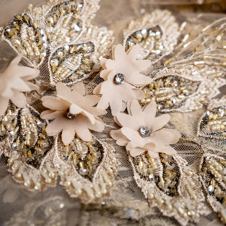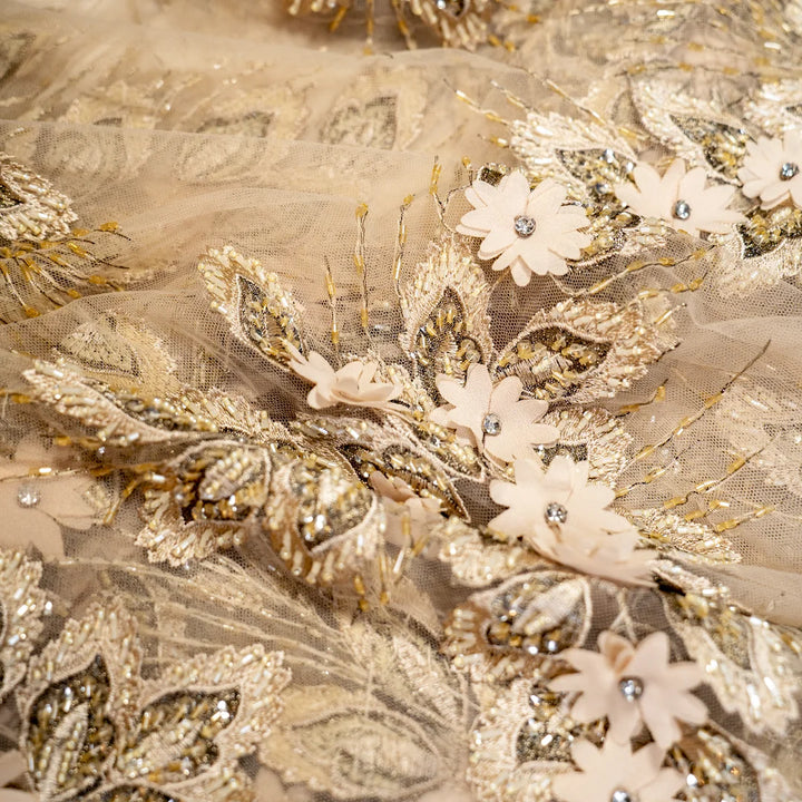 A champagne beige net fabric featuring sequin-embellished leaves, 3D floral appliqués, pearl beads, and golden thread highlights. The interplay of shimmer, texture, and depth gives it a glamorous, couture-worthy appeal—ideal for bridal lehengas, gowns, sarees, dupattas, blouses, and luxurious overlays.