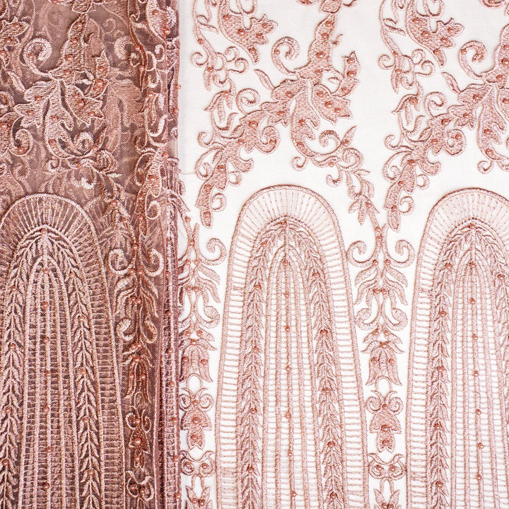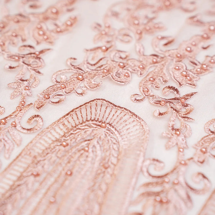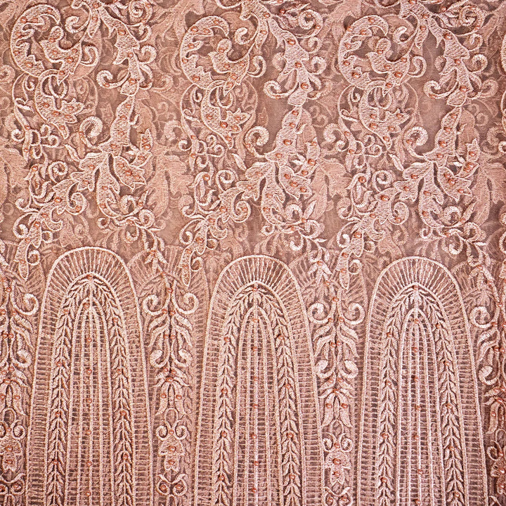A luxurious sheer net base adorned with rose gold embroidery, featuring intricate arch motifs, baroque vines, and delicate sequin embellishments. A perfect choice for cocktail sarees, bridal dupattas, lehengas, evening gowns, jackets, and festive couture ensembles.