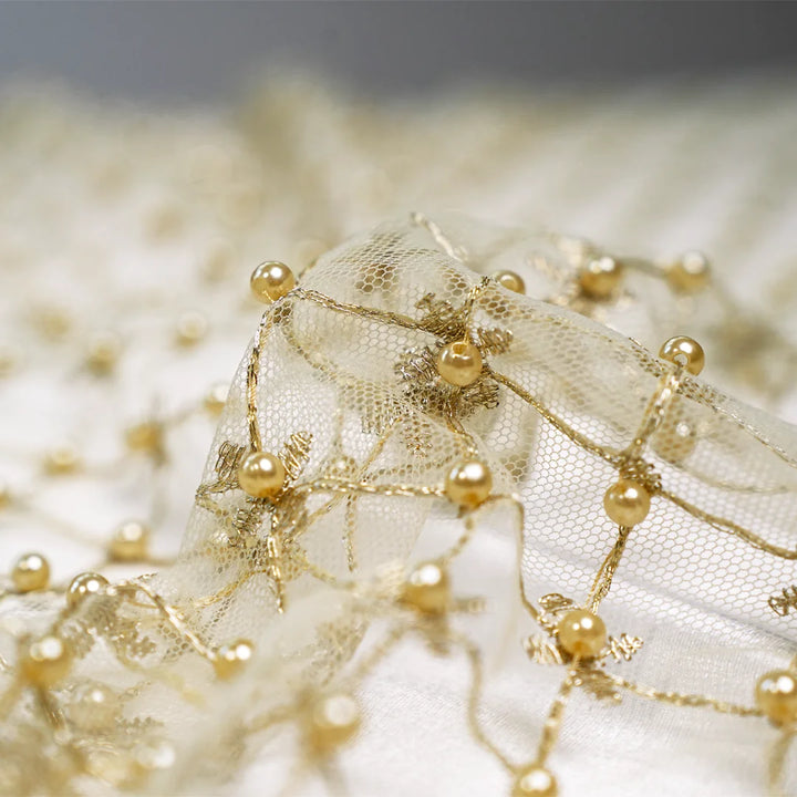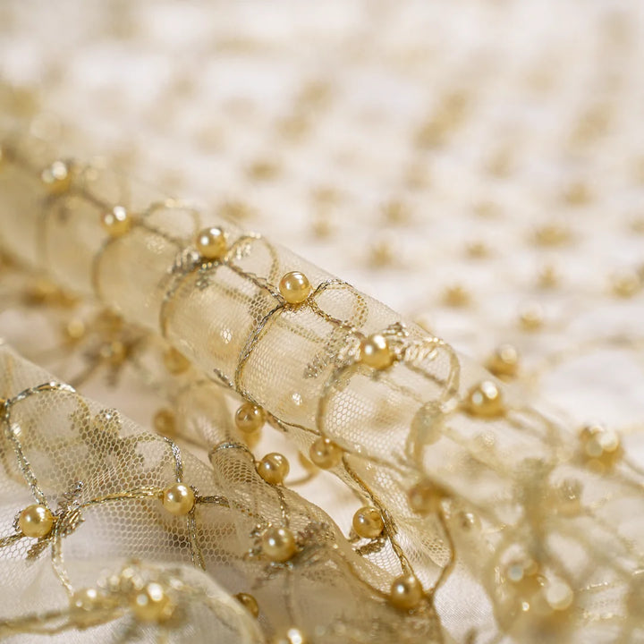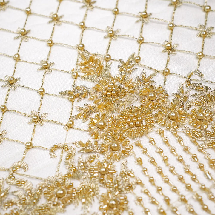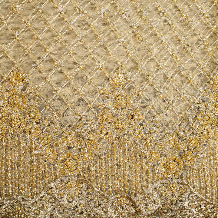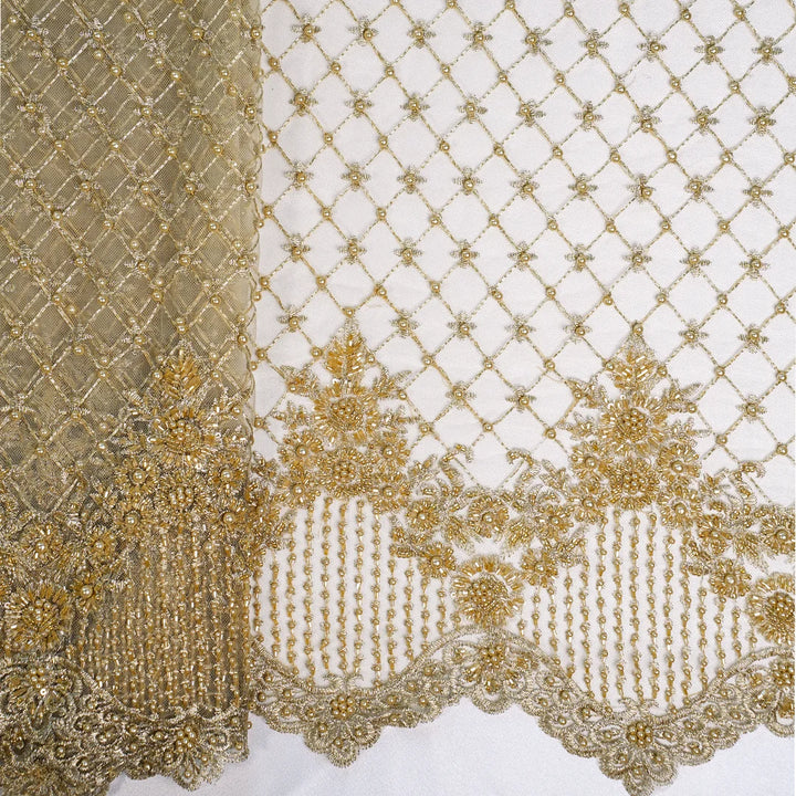 A rich gold net fabric featuring intricate golden zari, cutdana, seed bead, and pearl hand embroidery. Designed with a floral lattice pattern and scalloped borders, it exudes elegance and luxury—perfect for bridal and couture ensembles.