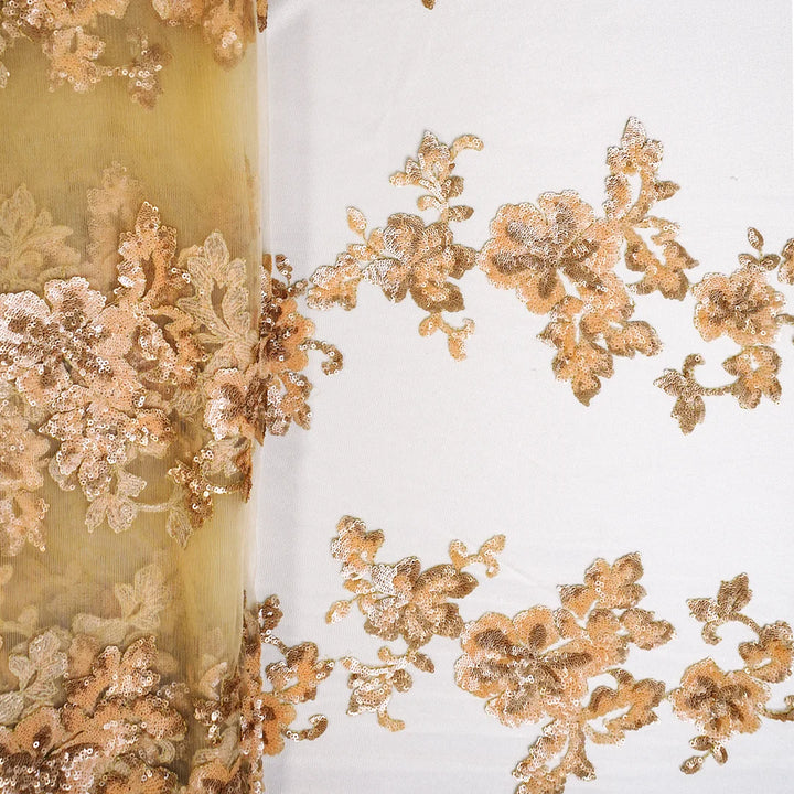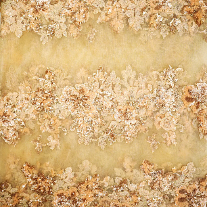 A soft tulle base beautifully embellished with golden floral sequin embroidery, featuring intricate handwork for a luxurious and elegant appeal. Perfect for statement-making couture and bridal wear.