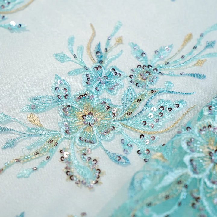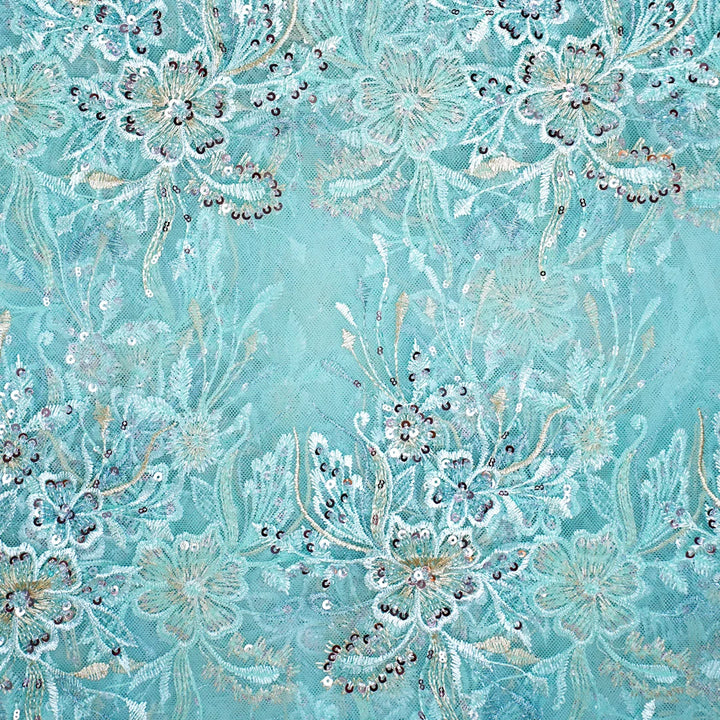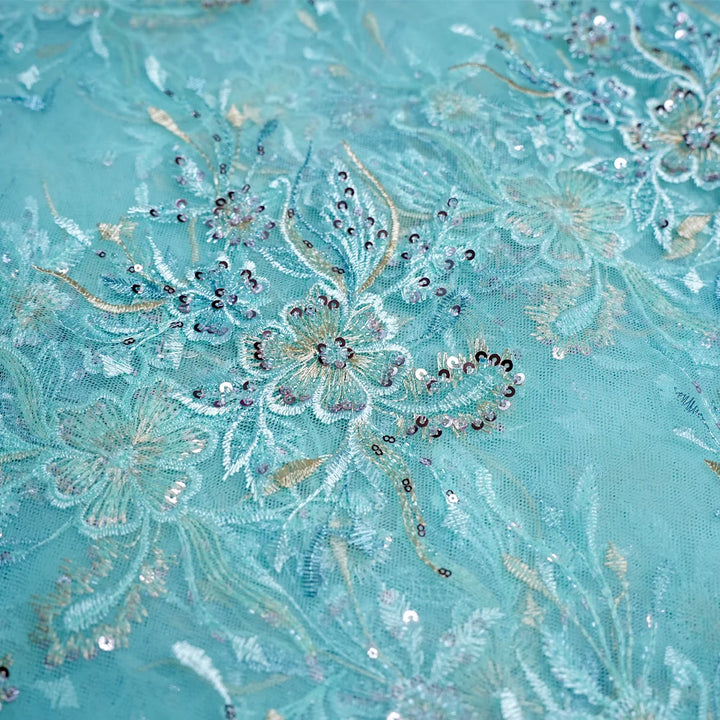 This fabric features intricate floral embroidery with metallic gold and silver threads, delicately enhanced by shimmering sequins. The soft aqua blue base adds an elegant charm, making it a luxurious choice for statement outfits.